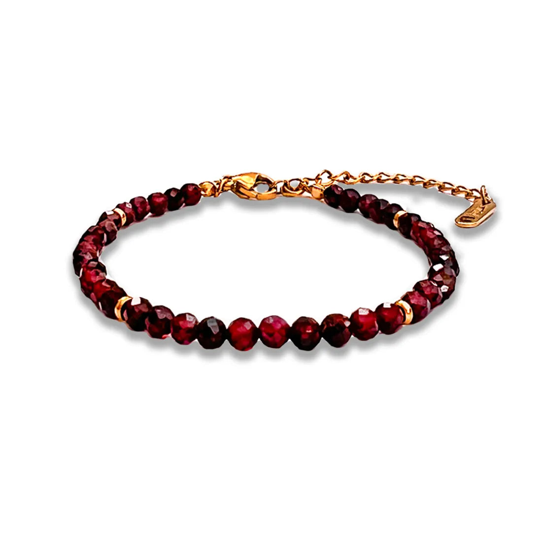 It’s made from natural garnet stone beads with a faceted finish and non-tarnish PVD 18K gold-plated elements.